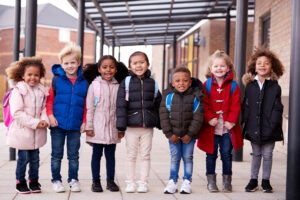 A group of smiling young multi-ethnic school kids wearing coats and carrying schoolbags standing in a row in walkway outside their infant school smiling to camera, full length, front view